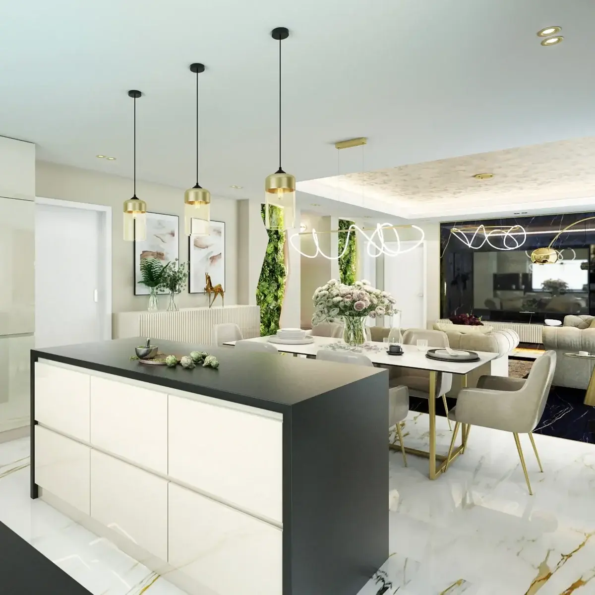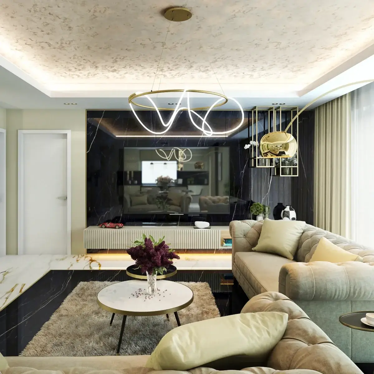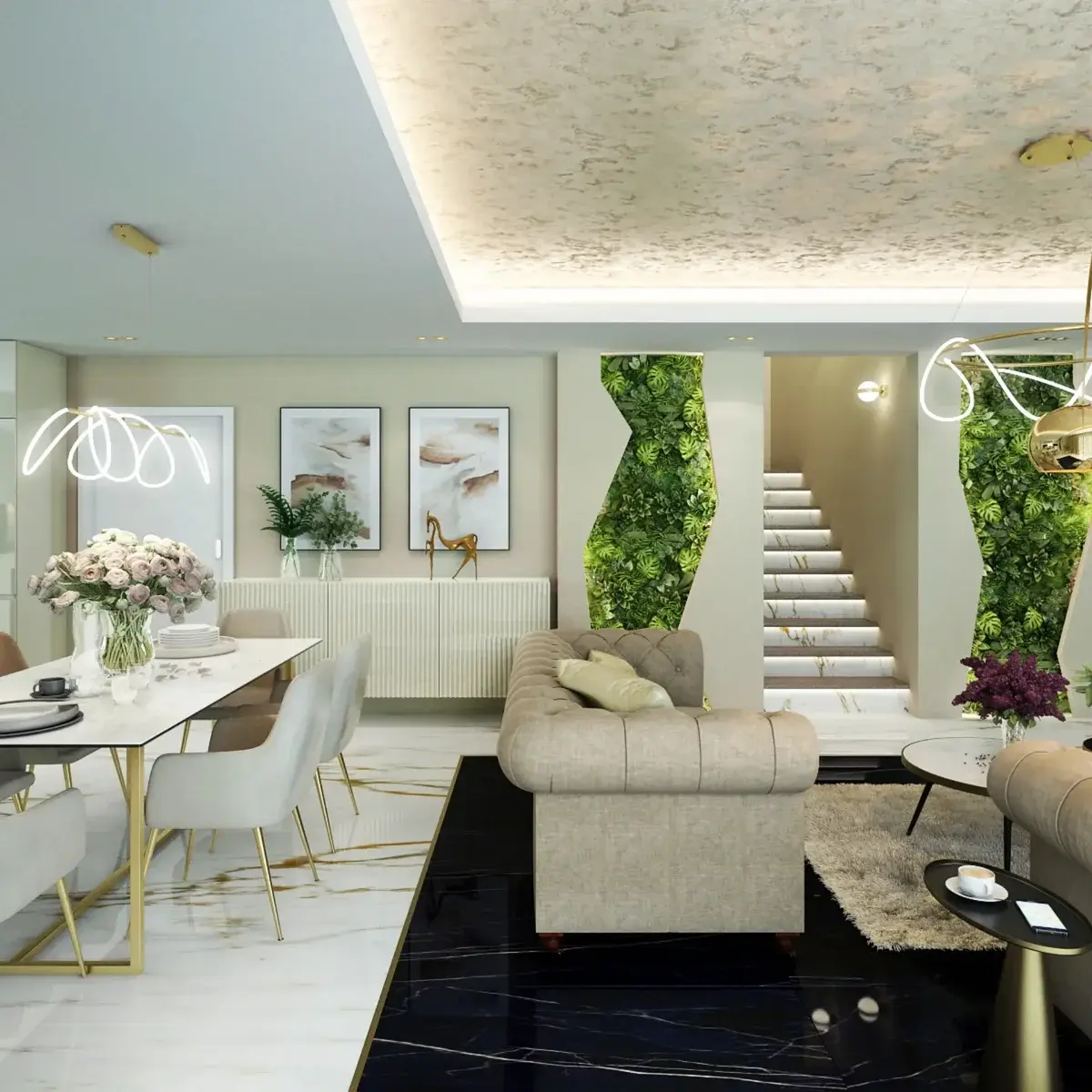 Kontrast mezi přírodní zelení a neutrálními tóny nábytku vytváří vyvážený celek, který spojuje moderní styl s klidnou atmosférou domova. Jemné osvětlení, doplňky z přírodních materiálů a promyšlené detaily dodávají interiéru jedinečný charakter. Tento luxusní prostor je důkazem, že i moderní interiér může působit hřejivě, přirozeně a zároveň reprezentativně.