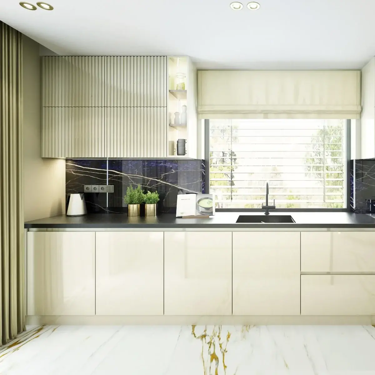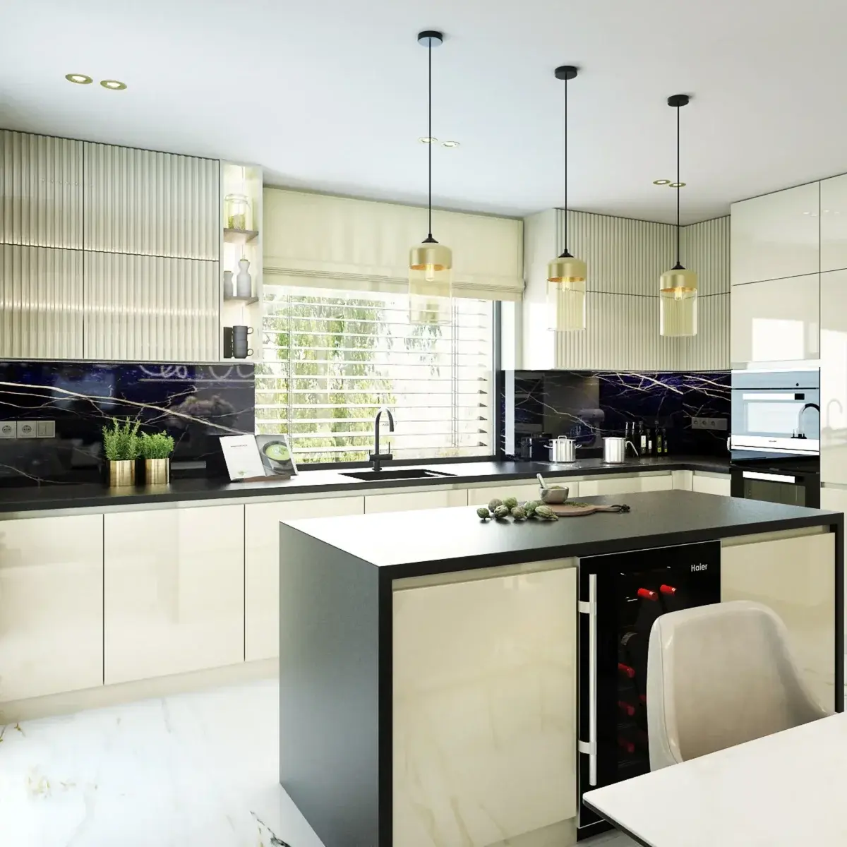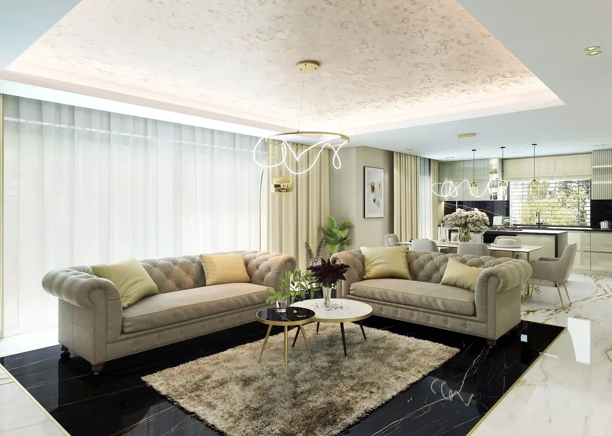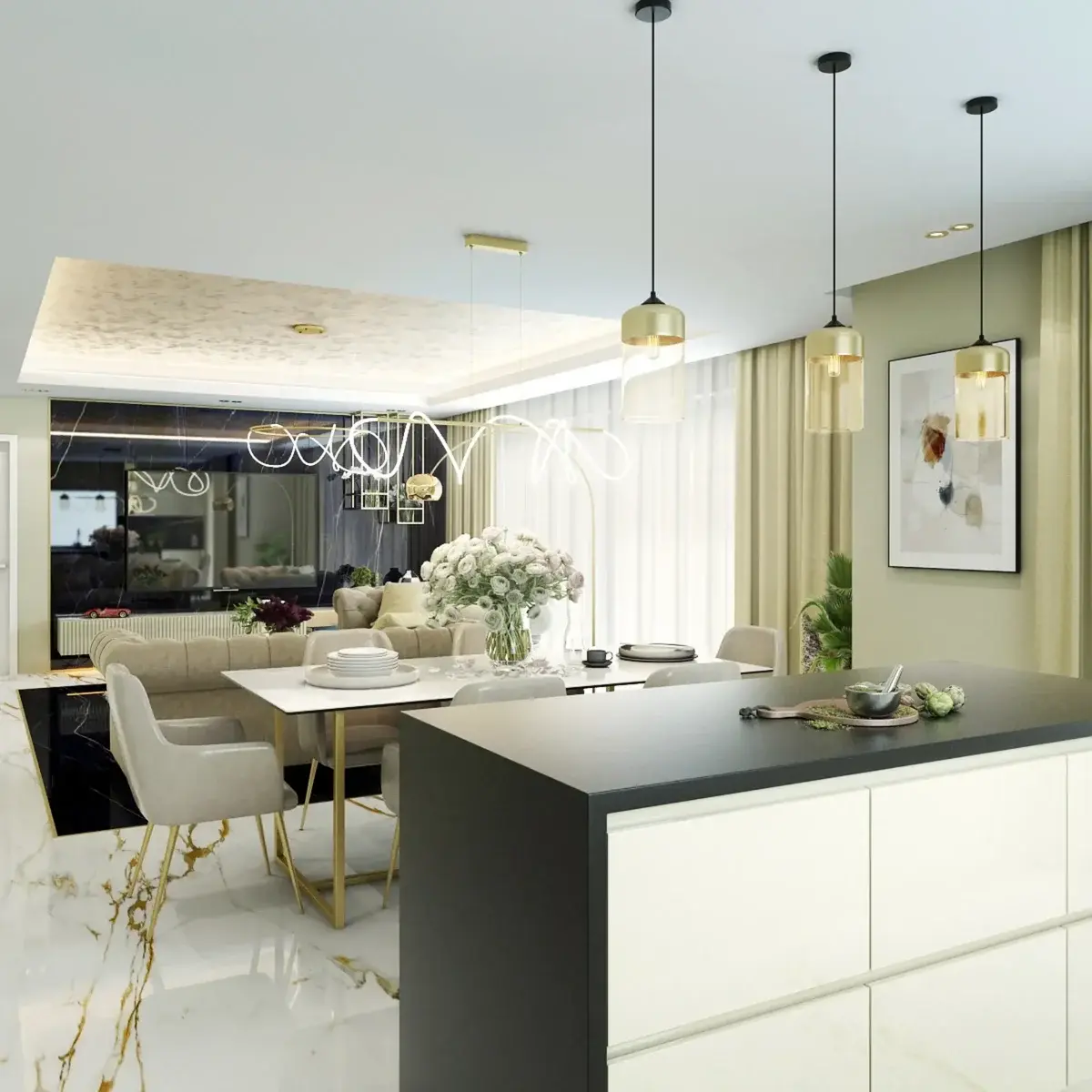 Kontrast mezi přírodní zelení a neutrálními tóny nábytku vytváří vyvážený celek, který spojuje moderní styl s klidnou atmosférou domova. Jemné osvětlení, doplňky z přírodních materiálů a promyšlené detaily dodávají interiéru jedinečný charakter. Tento luxusní prostor je důkazem, že i moderní interiér může působit hřejivě, přirozeně a zároveň reprezentativně.